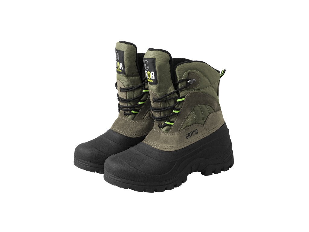 Boty Delphin GATOR jsou určeny na extrémní výpravy zejména v chladnějších obdobích roku. Zvýšený gumový lem podrážky sahá až do výšky kotníků, to znamená, že chůze v loužích, rozbředlém sněhu a blátě není pro GATOR problém. Tato pryžová část se navíc velmi dobře čistí. V zadní části gumové části boty se nachází výstupek, díky kterému si botu bez problémů zujete. Svršek boty je tvořen kombinací odolné nylonové látky a umělé kůže. Tyto materiály dobře odolávají nepřízni počasí a jednoduše se v případě potřeby impregnují. Jazyk boty je přišitý až do výšky 17cm, to znamená, že krátkodobě se můžete pohybovat v takto hlubokých vlhkých oblastech. Šněrování je řešeno přes textilní očka, na vrchu šněrování se nachází jedno kovové oko. Vnitřek boty je tvořen příjemným mikrofleecovým materiálem. O tepelné pohodlí se postará vrstva umělého mikrovlákna mezi vnější a vnitřní vrstvou. Černo-zelenou kombinaci materiálů ocení nejen rybáři, ale i myslivci, turisté a všichni ostatní milovníci přírody. I přes svou mohutnost jsou boty velmi lehké, což jistě přijde vhod při dlouhodobější chůzi. Například obě boty velikosti 43 váží pouze 1200g.