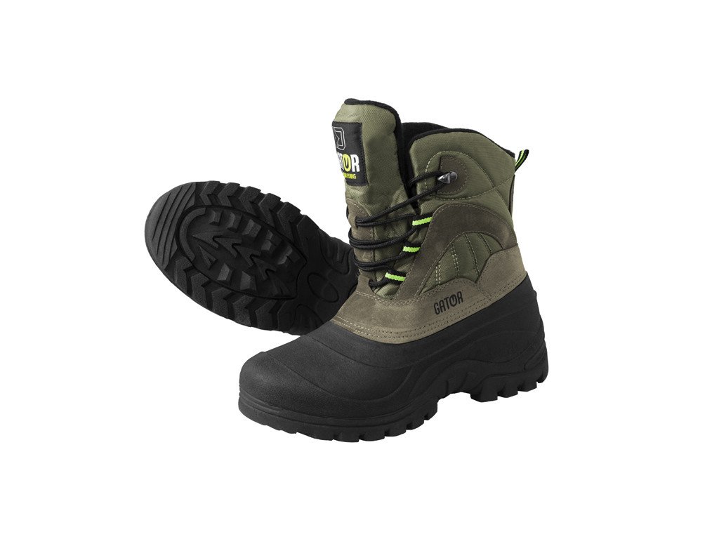 Boty Delphin GATOR jsou určeny na extrémní výpravy zejména v chladnějších obdobích roku. Zvýšený gumový lem podrážky sahá až do výšky kotníků, to znamená, že chůze v loužích, rozbředlém sněhu a blátě není pro GATOR problém. Tato pryžová část se navíc velmi dobře čistí. V zadní části gumové části boty se nachází výstupek, díky kterému si botu bez problémů zujete. Svršek boty je tvořen kombinací odolné nylonové látky a umělé kůže. Tyto materiály dobře odolávají nepřízni počasí a jednoduše se v případě potřeby impregnují. Jazyk boty je přišitý až do výšky 17cm, to znamená, že krátkodobě se můžete pohybovat v takto hlubokých vlhkých oblastech. Šněrování je řešeno přes textilní očka, na vrchu šněrování se nachází jedno kovové oko. Vnitřek boty je tvořen příjemným mikrofleecovým materiálem. O tepelné pohodlí se postará vrstva umělého mikrovlákna mezi vnější a vnitřní vrstvou. Černo-zelenou kombinaci materiálů ocení nejen rybáři, ale i myslivci, turisté a všichni ostatní milovníci přírody. I přes svou mohutnost jsou boty velmi lehké, což jistě přijde vhod při dlouhodobější chůzi. Například obě boty velikosti 43 váží pouze 1200g.