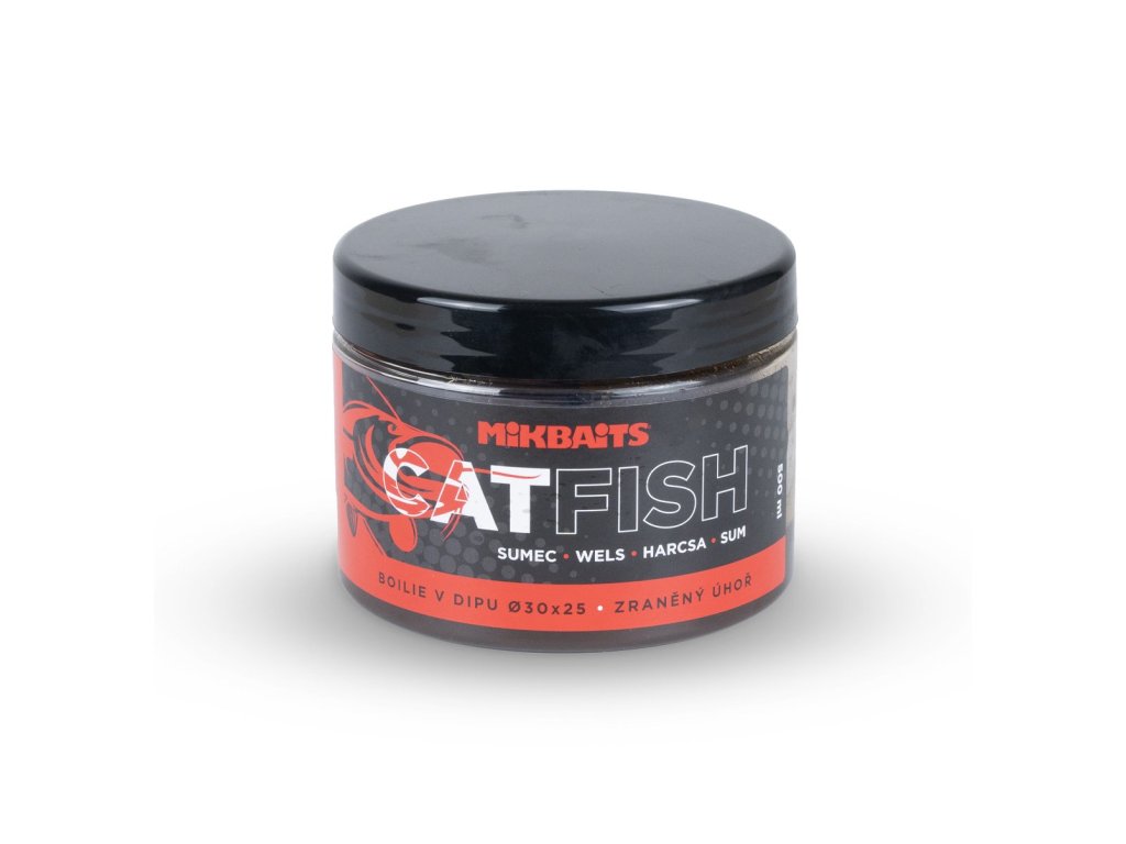 Catfish boilie v dipu jsou velké nástrahy 30x25 mm určené především k lovu sumců, na které se ulovily i ryby přes 2 m délky. Jsou to masově rybí nástrahy s příchutí ryb, jater a mořských živočichů.