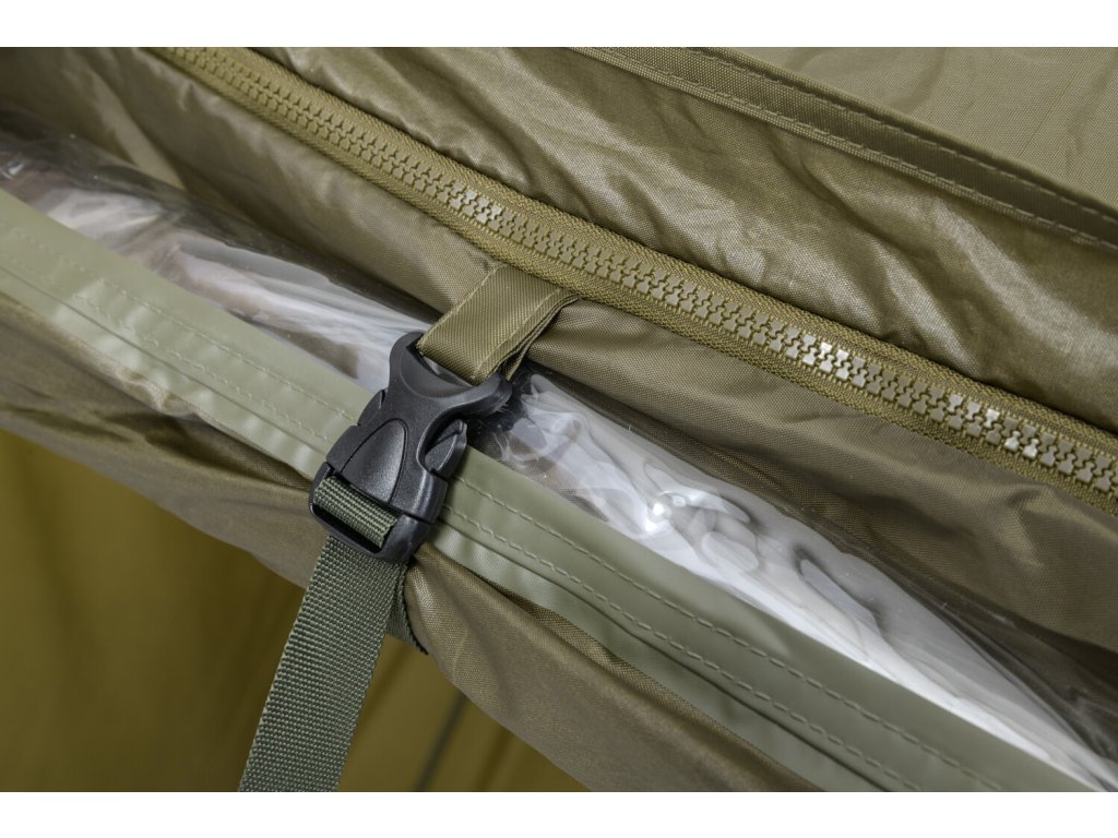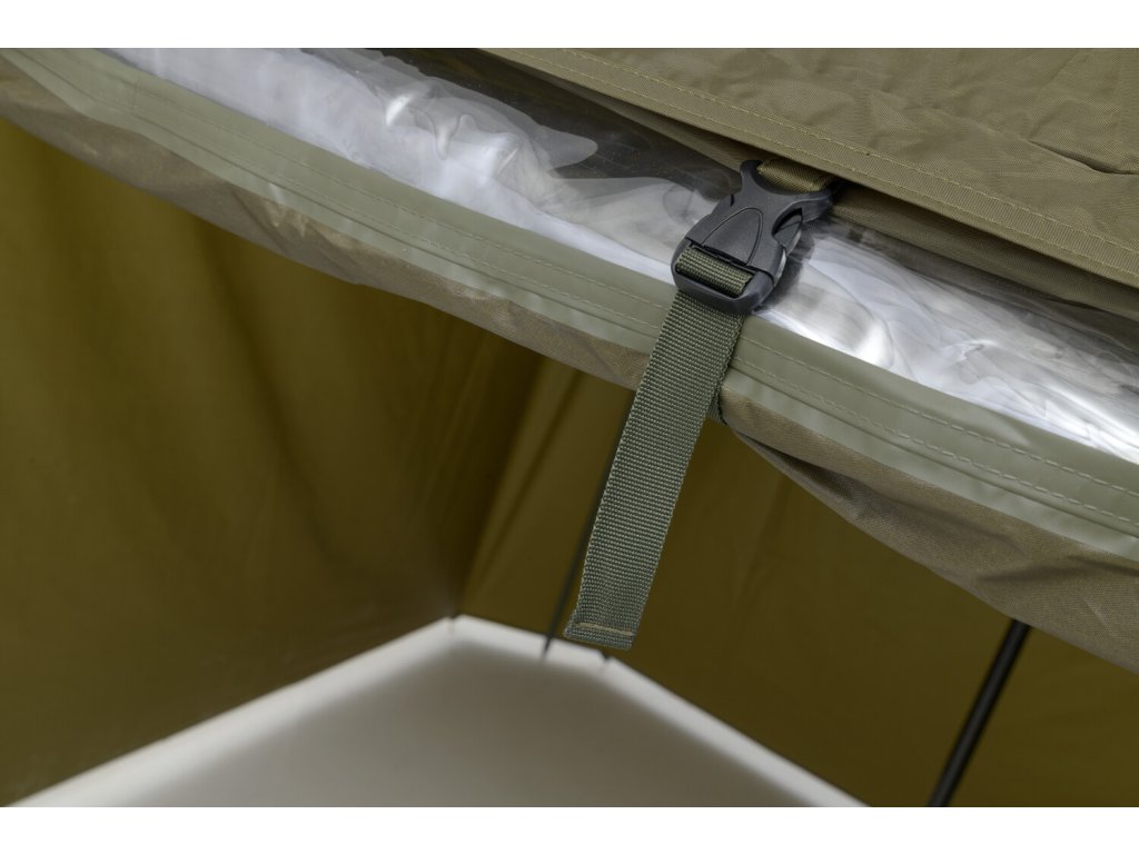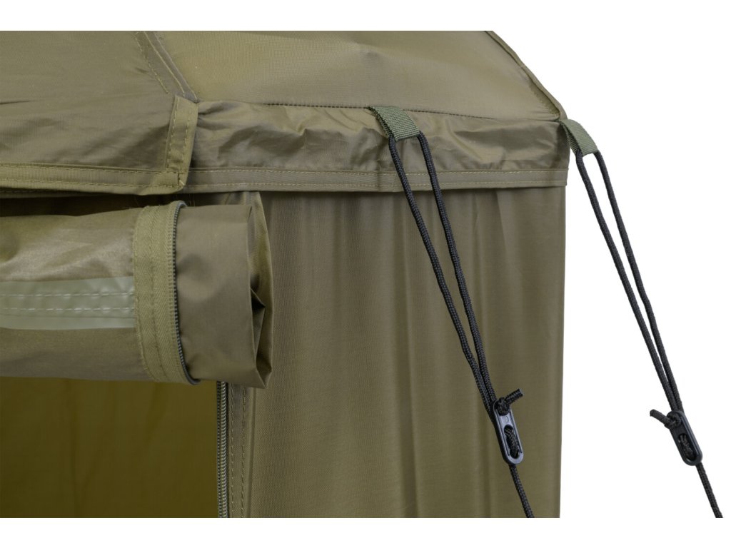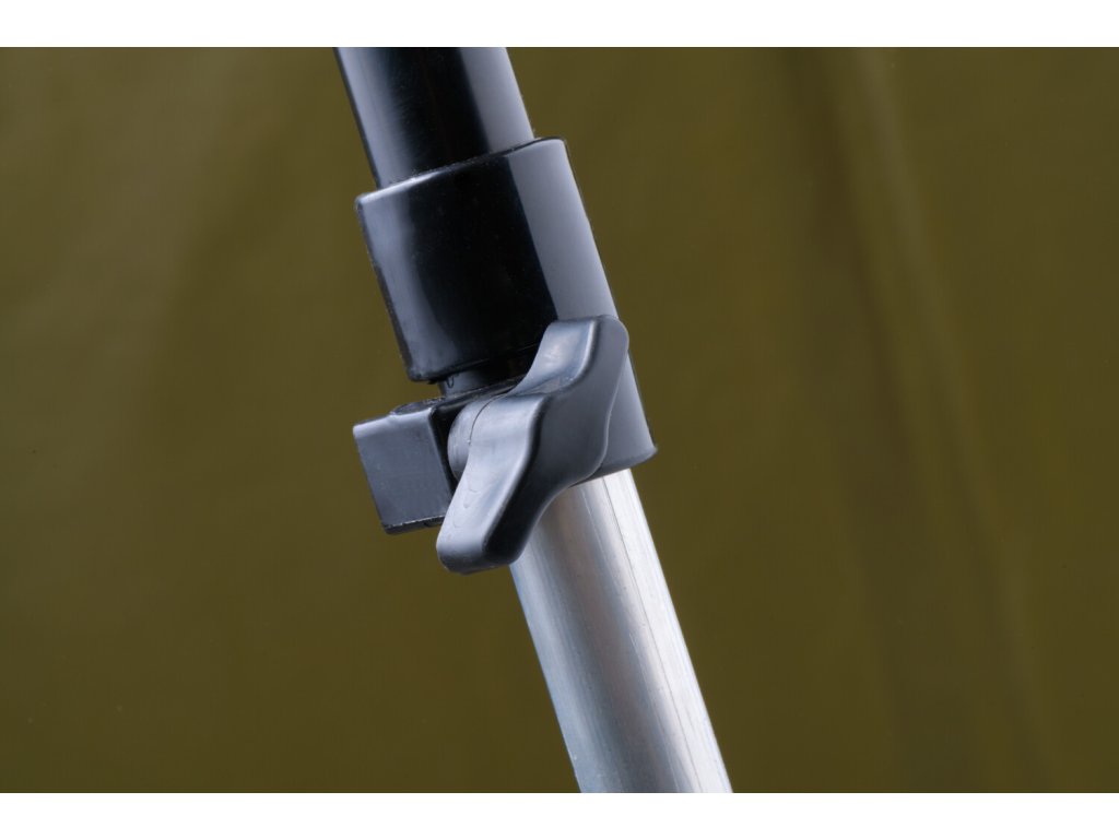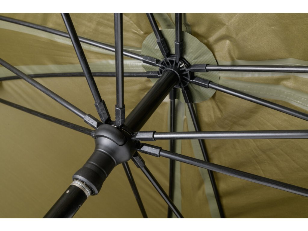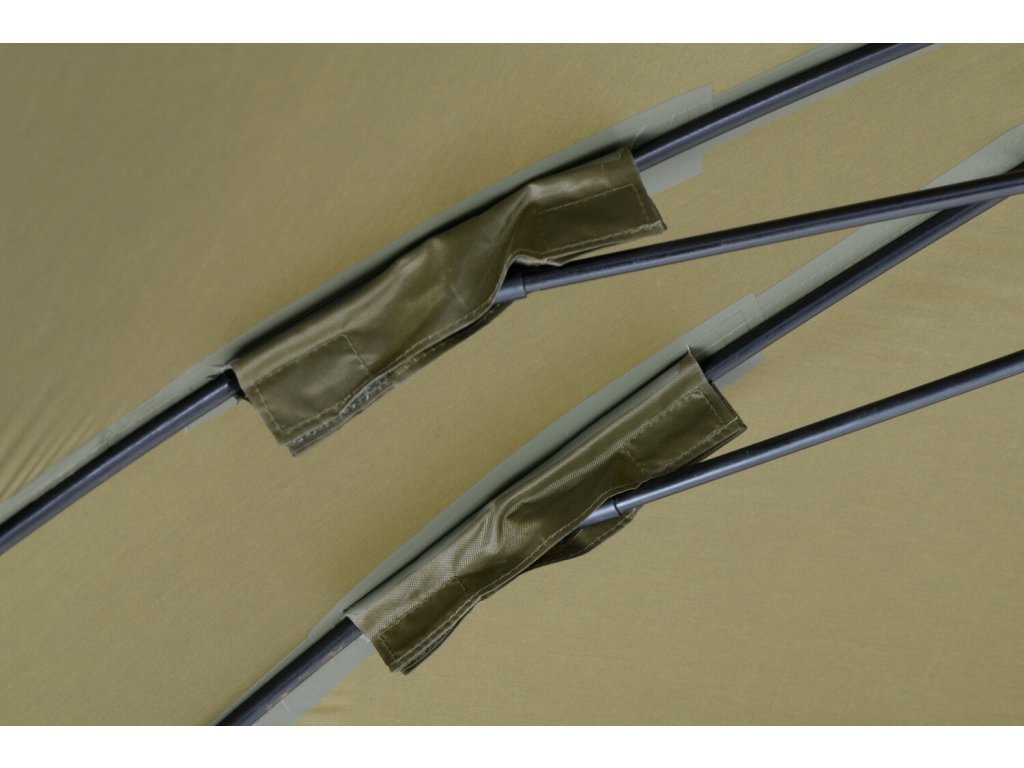 Kompletně zakrytý deštník čtvercového tvaru s obřími rozměry. Lze do něj umístit dvě velká rybářská lehátka. Rozměrům deštníku je plně přizpůsobena jeho konstrukce a použité materiály. Kostra je vyrobena z pevných a pružných laminátových žeber, které kromě vysoké tuhosti a stability zajišťují i velkou odolnost. Tu oceníte zejména při silném větru, kdy by standardní drátěná žebra byla zdeformována či zcela zničena. Kvalitní nylonový plášť nabízí velmi nízkou hmotnost, nekompromisní vodní sloupec 8000mm a kompletně podlepené švy. Bočnice je po celém obvodu připevněna robustním zipem, krytým okapničkou. Přední panel s rozměrným oknem lze snadno rozepnout a srolovat nahoru. Ve větrném počasí je možné deštník stabilizovat pomocí čtyř kotvících lanek. Součástí dodávky je i sada plnohodnotných bivakových kolíků pro perfektní ukotvení i v náročných podmínkách. Skvělým doplňkem tohoto deštníku je unikátní stabilizační sada do extrémních podmínek dodávaná samostatně.