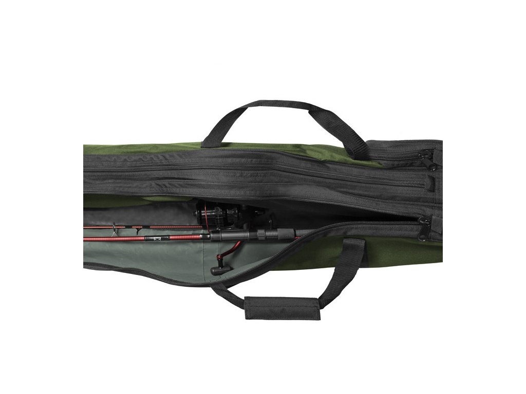 Dvoukomorové pouzdro Delphin CLASSA je praktické pouzdro se dvěma oddělenými komorami. Oba pruty s navijáky budou umístěny odděleně a nedojde tak k jejich poškození během přepravy. Vyrobeno je z odolného textilního materiálu, v kombinaci černé a tmavozelené barvy. Samozřejmostí je i použití kvalitních zipů. Na spodní části se nachází kapsa, která poslouží na odložení rybářského příslušenství. Pouzdro je vybaveno jedním dlouhým popruhem pro nošení přes rameno a dvěma krátkými popruhy, které umožňují přepravu v ruce.