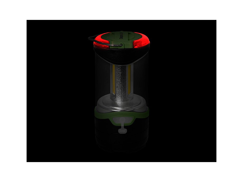 Lampu Delphin LUNA UC využijete na rybářských toulkách, na turistice či v kempu. Váží skvělých 261 gramů a díky jejím kompaktním rozměrům ji ve vaší výbavě ani neucítíte. Nabízí 4 režimy svícení: po prvním stisku svítí 100% svítivostí, po druhém stisknutí svítí na 50%, třetím stlačením aktivujete permanentní červené světlo a čtvrtým stisknutím červené světlo bliká. 3 LED panely s bílým světlem a vrchní červené LED diody jsou napájeny vyměnitelnou baterií typu 18650. Lucerna tak dokáže podat výkon 5W se svítivostí 220 lumenů. Baterii lze dobíjet přiloženým USB-C kabelem. Kempinkovou lampu je možné postavit na pevný podklad, nebo zavěsit na kovové očko, které se nachází v horní části. Dobíjecí konektor je chráněn gumovou krytkou.