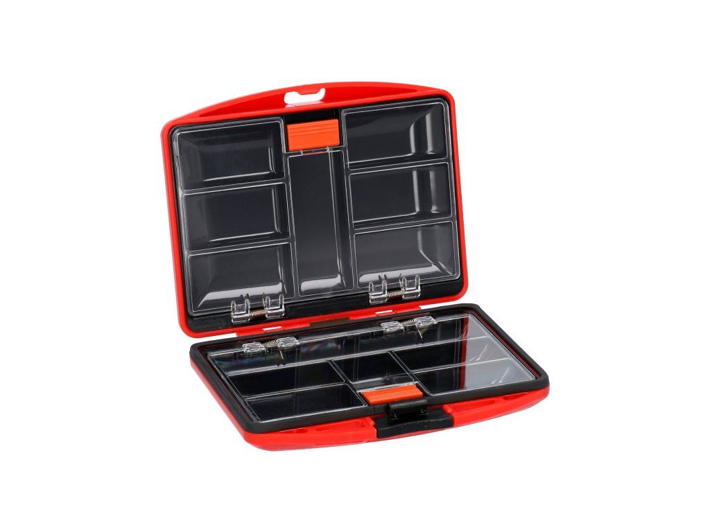 Velmi praktická oboustranná krabička na příslušenství, vyrobená ze silného plastu s pevnými přihrádkami. Průhledné provedení umožňuje snadné vyhledání potřebných drobností, nastavitelné přihrádky umožňují individuální uspořádání.