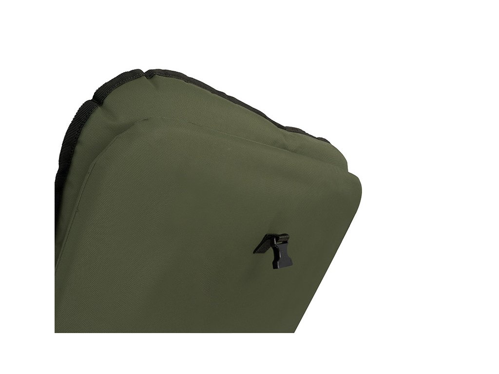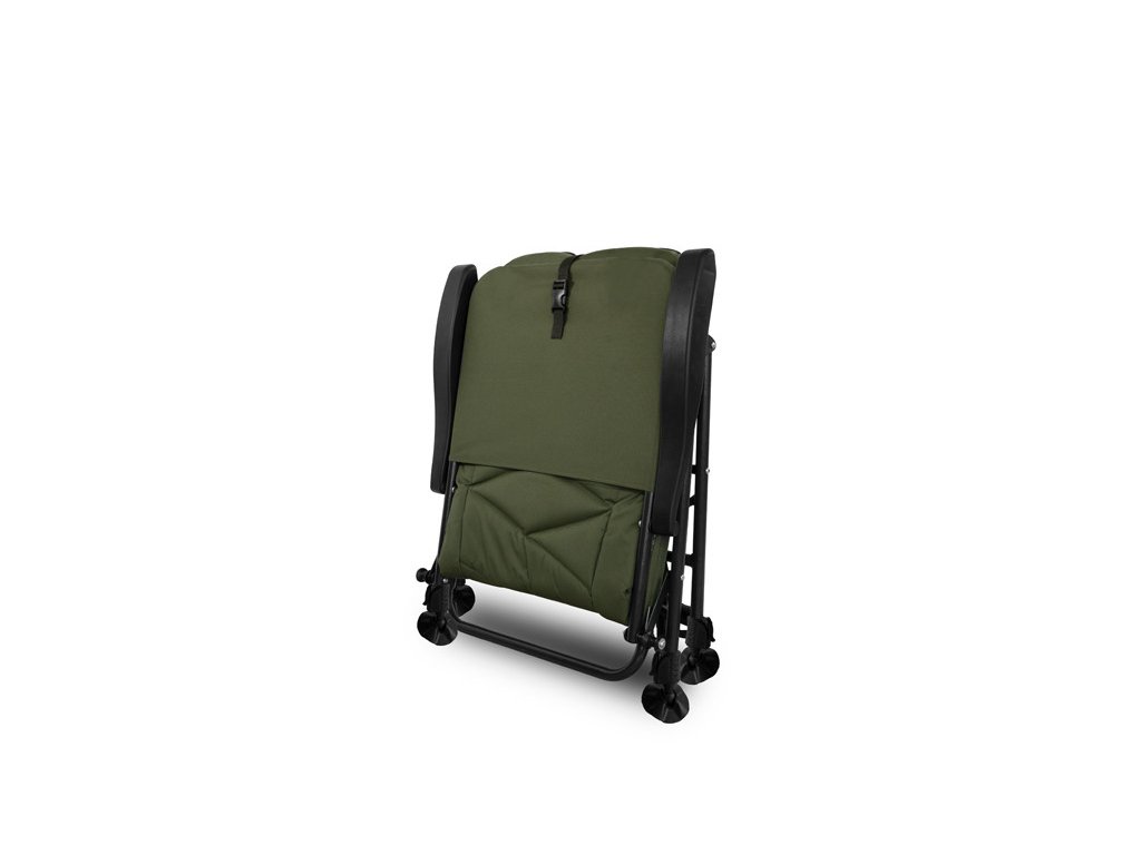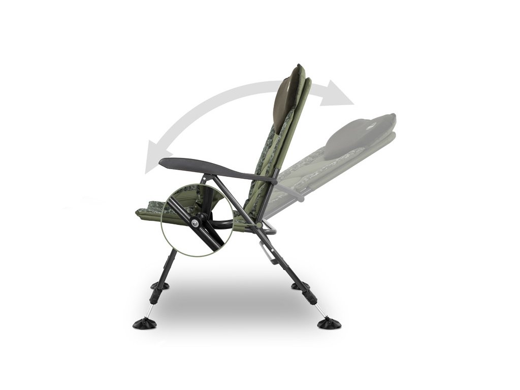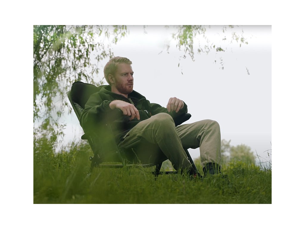 Nastavitelný mechanismus umístěný v loketních opěrkách křesla umožňuje měnit úhel opěradla v závislosti na potřebách rybáře. O maximální pohodlí hlavy a krční páteře se stará extra polstrovaný fleecový panel tmavě zelené barvy opatřeným logem produktu. Matrace je v zádové a sedací části tvořena odolnou 600D látkou s jedinečným šikmým prošíváním. Po okrajích je umístěna 600D látka s patentovanou C2G kamufláží. Pro příjemnější překlenutí času mezi záběry jsme křeslo vybavili ergonomicky tvarovanými područkami pro dokonalý komfort při relaxování a sledování okolní přírody.