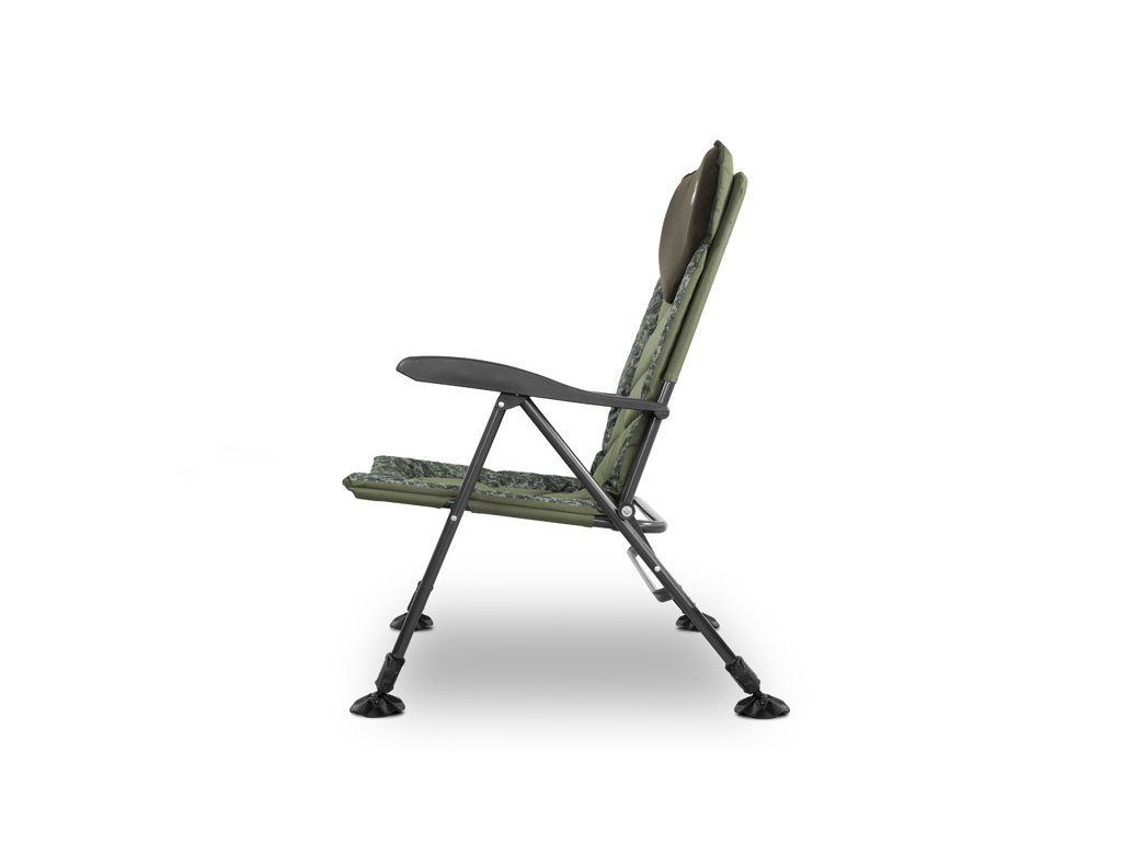 Výškově nastavitelné nohy umožňují přizpůsobit křeslo nerovnoměrnému terénu při lovu v náročných podmínkách. Zajištění polohy křesla zabezpečují také flexibilní robustní patky, jejichž velká plocha zabraňuje zaboření nohou křesla do rozmočeného terénu u vody.