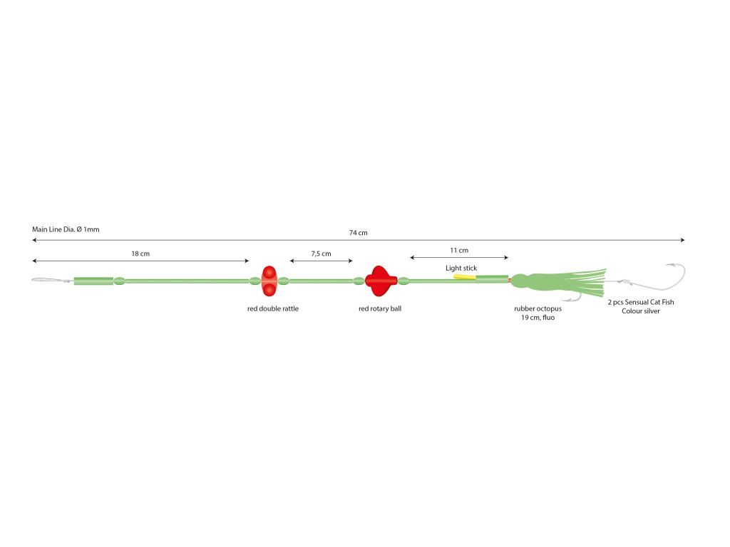 Tato montáž s jednou chobotnicí a dvěma háčky je ideální pro lov na velké filety, nebo celé ryby. Skvěle se chová na velkých hloubkách. Loví velké ryby. Vhodné pro lov velkých: halibutů, tresek, mníků.