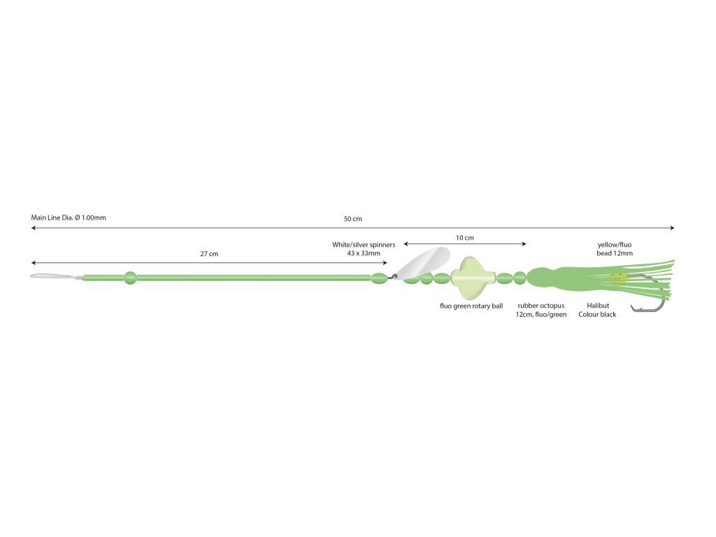 Montáž s chobotnicí, vynikající pro lov ve velkém proudu na hloubkách od 30 do 500 m. Rotačka dodatečně vábí ryby k útoku. Doporučujeme pro lov tresek a mníků.