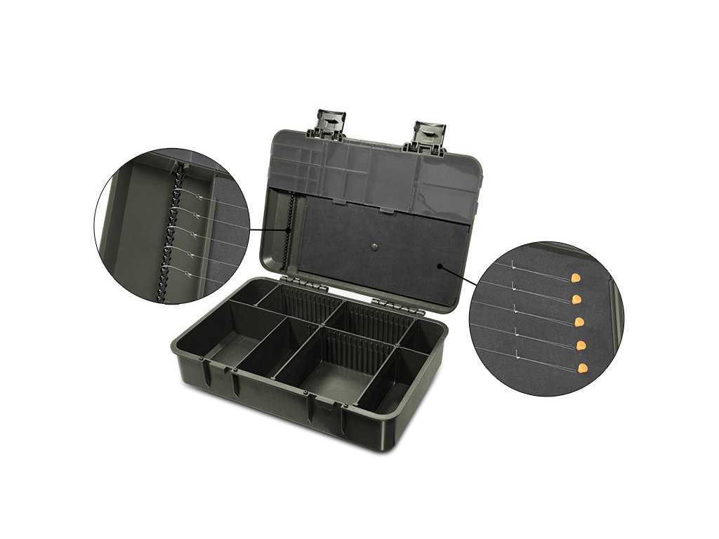 Ve spodní části boxu se nacházejí přihrádky, disponující vyjímatelnými přepážkami, čímž lze tento prostor přizpůsobit vašim požadavkům. Na vrchní straně je několik průhledných, uzavíratelných přihrádek různých rozměrů, které poskytují ideální prostor pro uložení drobné bižuterie. Díky jejich průhlednému provedení, budete mít vždy přehled o tom co se uvnitř nachází a potřebnou komponentu tak najdete během mrknutí oka. Kromě toho se na vrchní straně nachází také plato z tvrzené pěny a špendlíky, což umožňuje uchycení koncových montáží. KlikBOX Mega vám tak umožní sbalit vše potřebné k lovu, abyste byli vždy dokonale připraveni. K uzavření organizéru poslouží masivní klipy, které se postarají o to, aby vše zůstalo na svém místě.