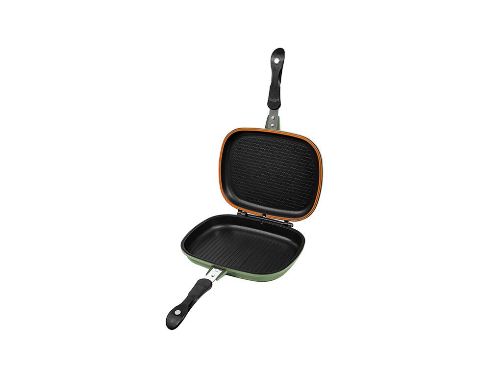 Díky magnetu na rukojeti jednotlivé poloviny po uzavření výborně drží spolu a pánev tak můžete během přípravy pokrmu libovolně obracet. O dokonalou těsnost se přitom stará obvodové těsnění odolné vysokým teplotám. Jednoznačně největší výhodu uzavřené pánve je fakt, že teplo se uvnitř mnohem rychleji akumuluje a během vaření neuniká z pánve ven. Díky tomu je příprava jídla v přírodě mnohem rychlejší a jednodušší.