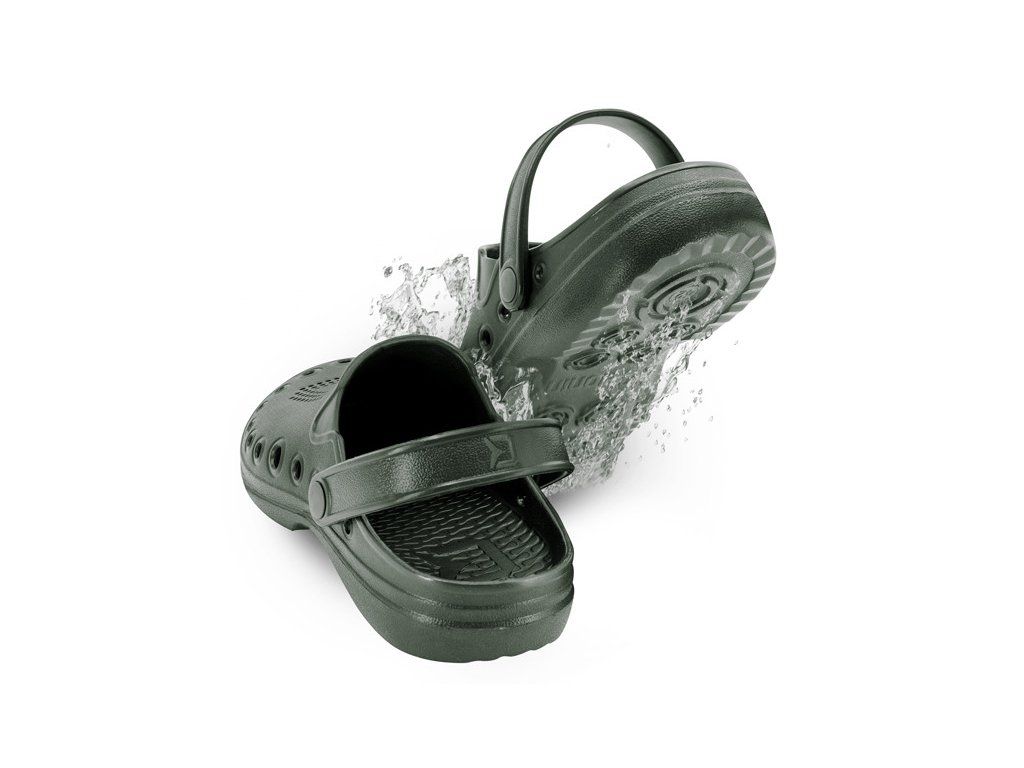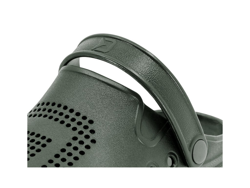 Dalším sofistikovaným prvkem jsou velké postranní otvory, jejichž prioritním úkolem je starat se o odvětrávání a celkovou vzdušnost v této obuvi. Záměrně nejsou navrženy ve výši podrážky, jak to bývá standardem, ale o něco výše. Právě tento detail hraje významnou roli během pobytu na břehu, či mělké vodě. Tím, že otvory jsou o něco vyšší nad vnitřní stélkou je téměř eliminováno nechtěné nabírání písku či kamínků mezi podrážku a chodilo. Vaše chodidla jsou tedy chráněny v maximální možné míře. Kromě těchto otvorů slouží k odvětrávání hustá perforace umístěna ve vrchní části. Ta je záměrně vytvarována na jedné straně do symbolu D z loga Delphin, na druhé vsuvce zase kraluje symbol O, jako počáteční písmeno názvu OCTO. Celkový dojem ještě zhodnocuje jemná struktura na povrchu pantoflí, která evokuje kůži chobotnice. Díky použitému EVA materiálu jsou mimořádně lehké, houževnaté a dokonce plovoucí. Samozřejmostí je u tohoto modelu poutko na fixaci paty (lidově nazývané i uzávěrka), které oceníte zejména v nerovné, či svahovitejšom terénu.