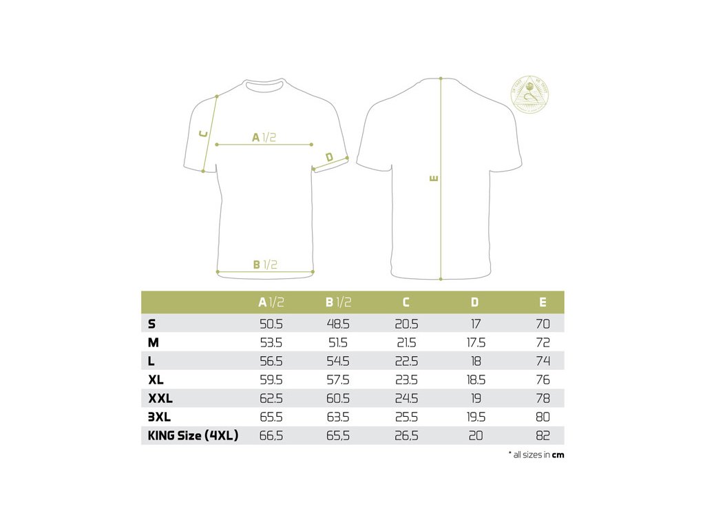 Samotné tričko je vysoké kvality, stejně jako použitý barevný tisk. Nabízíme je v široké škále velikostí od S až po KING SIZE (ekvivalent 4+XL, který je ve většině zemí označován jako XXXXXL). Model King size tedy hravě oblékne i ty nejstatnější rybáře o hmotnosti 135kg+.
