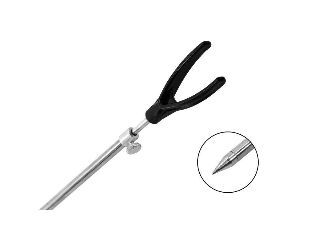 Velmi pevná, teleskopická, zadní vidlička s držákem na prut. Vyrobena je z oceli, díky čemuž je výjimečně pevná. Vrchní část rybářské vidličky je pevně osazena držákem prutu.